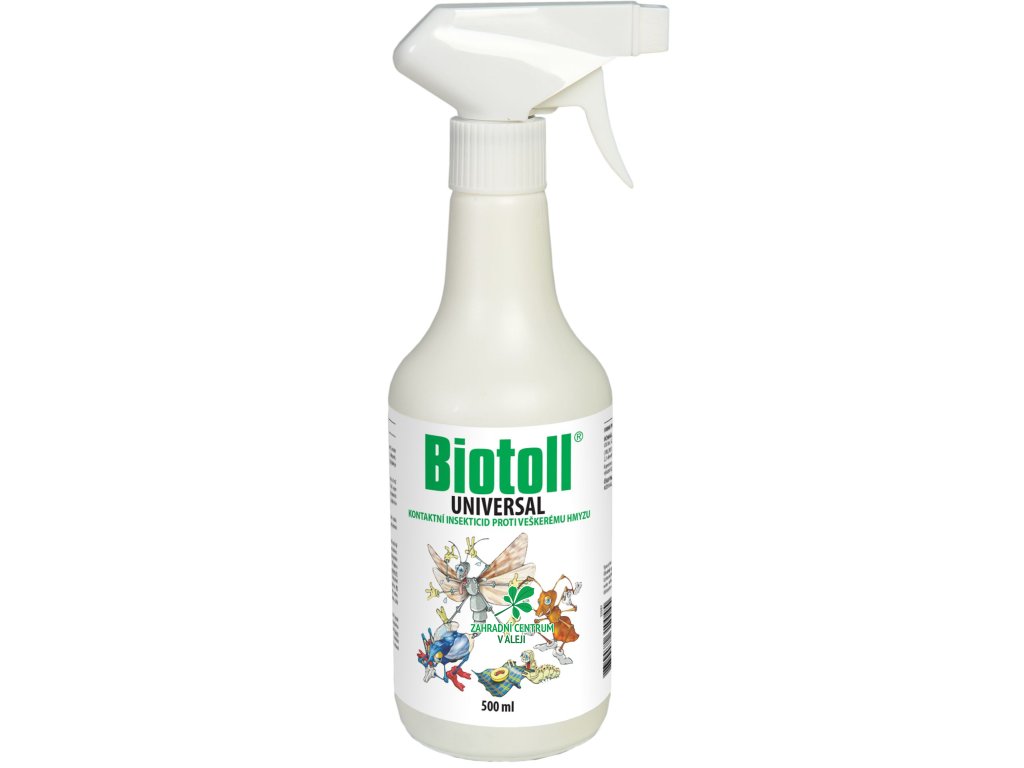 Biotoll univerzální insekticid je kontaktní a žaludkový insekticid s prodlouženým účinkem (2 - 3 týdny) a je odolný proti světlu. Přípravek je schválen pro použití v potravinářských provozech. Je určen k ochraně před létajícím (moucha, komár, mol, muška...) a lezoucím (mravenec, rybenka, šváb, blecha, veš...) hmyzem. Používáme ho také ve skladištích k hubení pilouse rýžového, korovníka obilního a lesáka skladištního.
