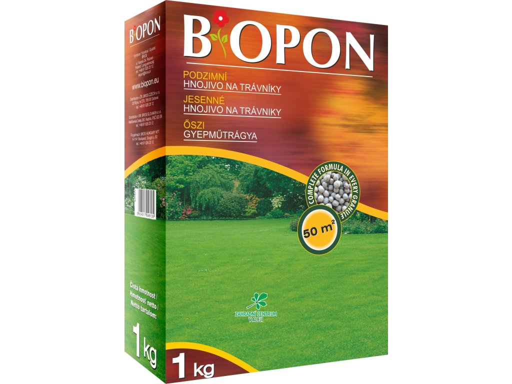 Bopon Podzimní trávník je pomocné hnojivo nezbytné k přípravě zeminy na podzimní-zimní sezónu. Toto hnojivo tvoří víceložkové granule (komplexní složení v každé granuli), je ideální na hnojení trávníku. Nedostatek dusíku způsobuje omezení růstu trávníku, takže během teplého období není nutné časté sečení. Vysoký obsah draslíku zvyšuje odolnost proti mrazu. Minerální hnojivo doplní živiny v půdě a vytvoří jejich zásoby potřebné pro vegetaci v příští sezóně.