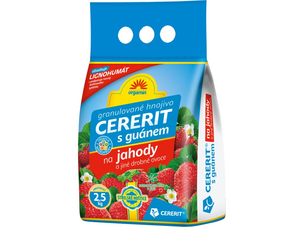CERERIT S GUÁNEM na jahody a jiné drobné ovoce je organominerální granulované hnojivo se stopovými prvky, určené pro jahody a jiné drobné ovoce. Výrobek obsahuje minimálně 60% originálního hnojiva CERERIT GSH NPK 8-13-11.