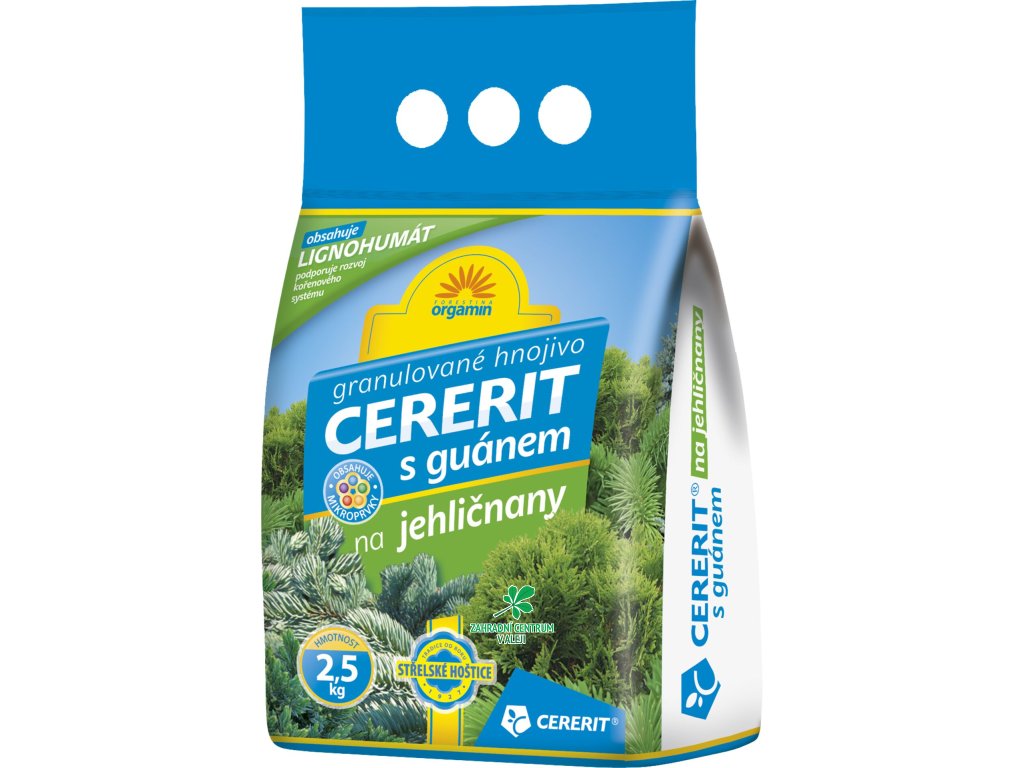 CERERIT S GUÁNEM na jehličnany a jiné okrasné keře je organominerální granulované hnojivo se stopovými prvky, určené k výživě jehličnanů a okrasných keřů. Výrobek obsahuje minimálně 60% originálního hnojiva CERERIT GSH NPK 8-13-11.