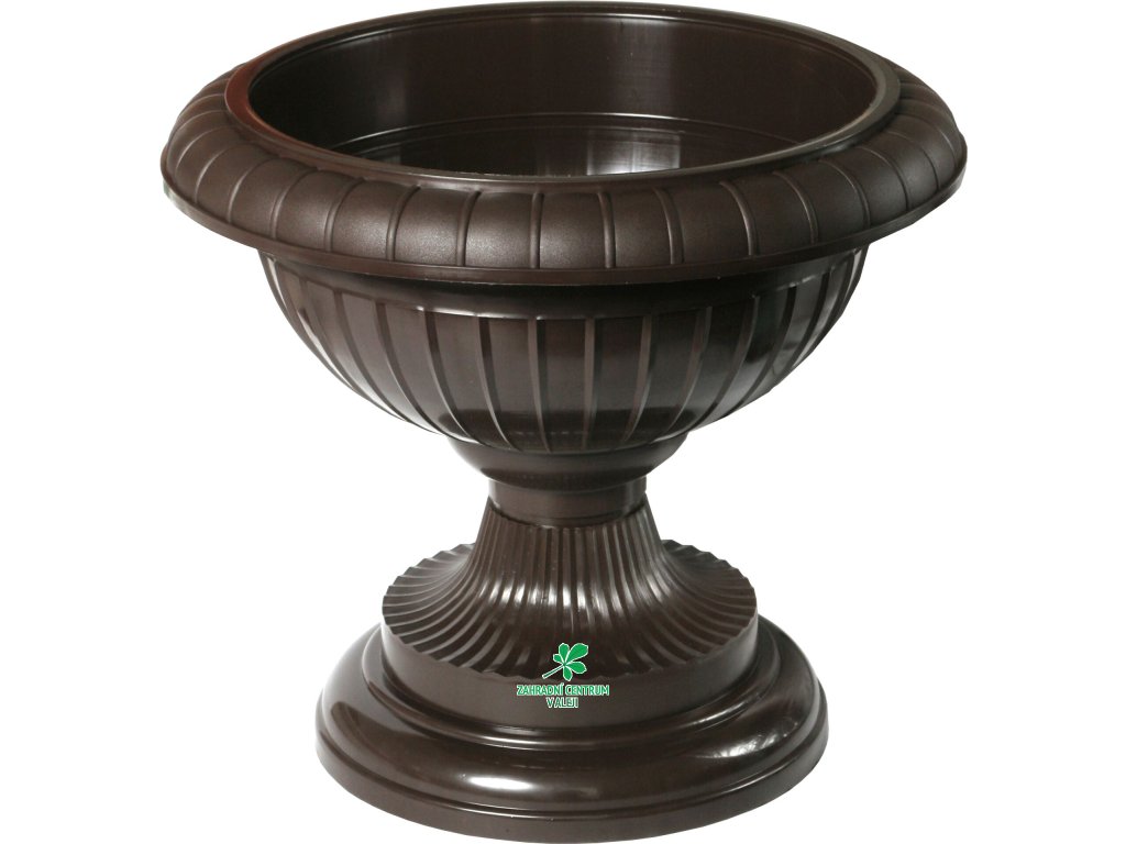 Květináč ve tvaru číše v hnědé barvě. Lze vyvrtat otvory pro odtok přebytečné vody.