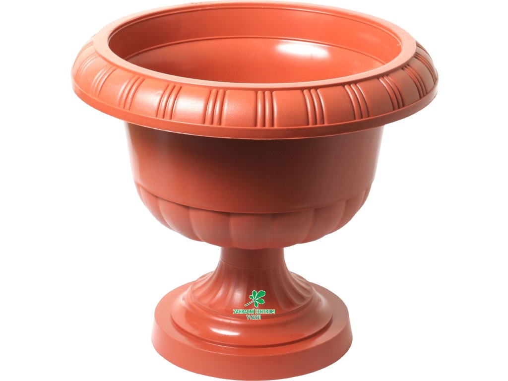Květináč ve tvaru číše v teracotové barvě. Lze vyvrtat otvory pro odtok přebytečné vody.