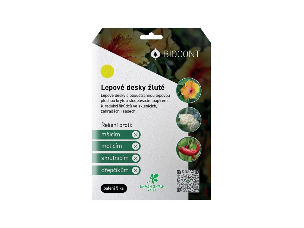 Žluté lepové desky k ochraně skleníků a foliovníků před molicemi, mšicemi, smutnicemi a vrtalkami a zahrádek před dřepčíky, blýskáčky, krytonostci, mšicemi a molicemi.