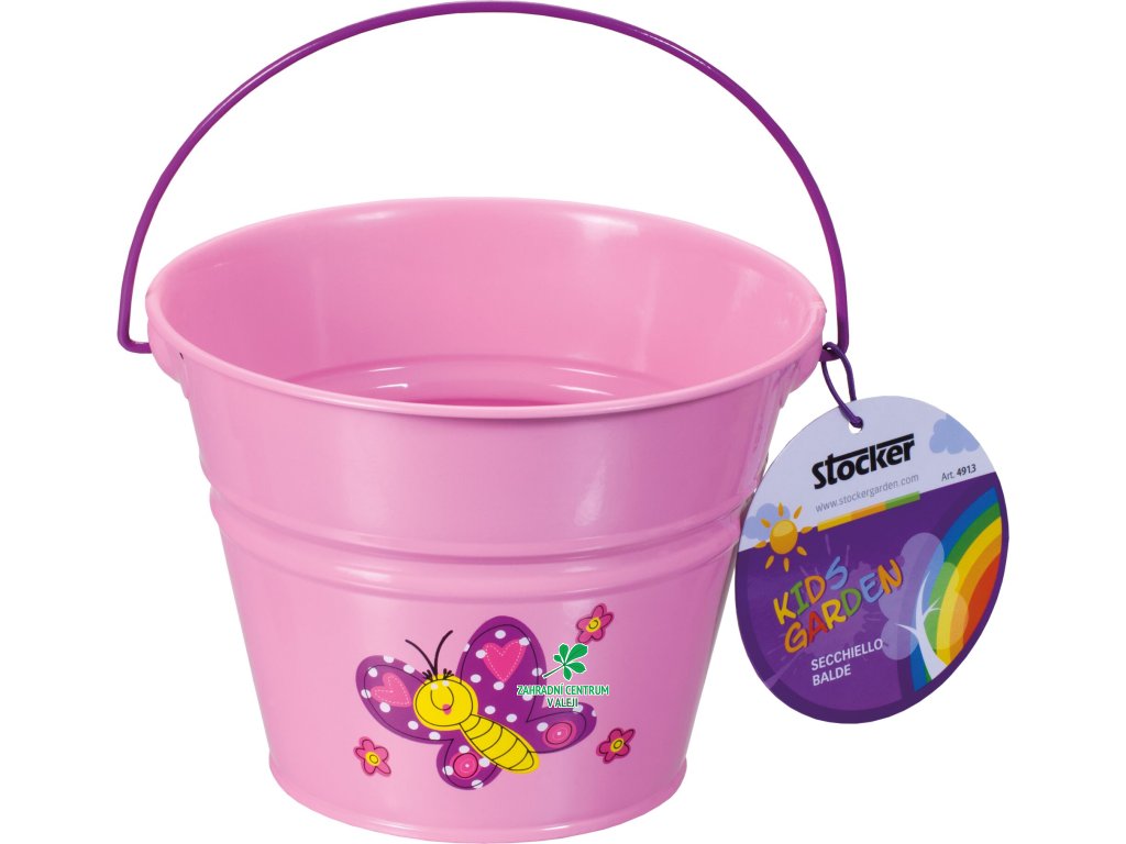 Dětský kovový kyblík v růžové barvě s obrázkem s dětským motivem.