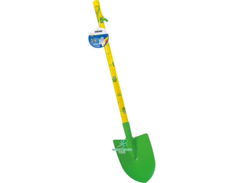 Velmi kvalitní a plně funkční dětský kovový rýč - se špicí v zelené barvě s barevnou násadou s dětskými motivy.