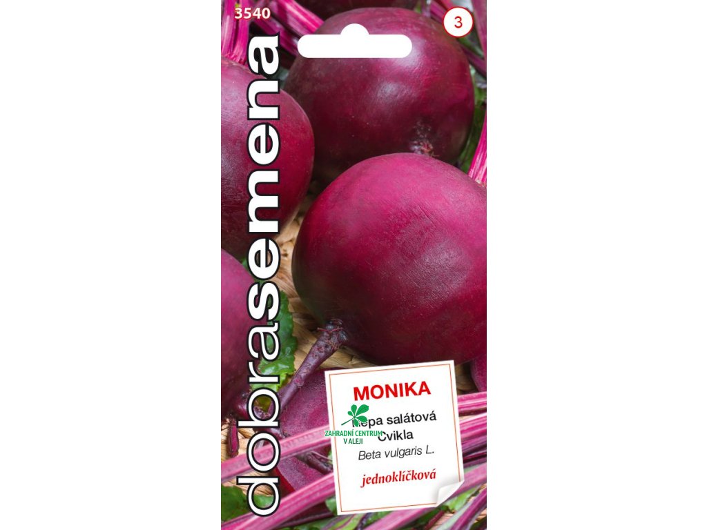 MONIKA ¦ jednoklíčková salátová řepa, která má pouze jedno vitální semeno v "klubíčku" a tudíž ji po vzejití není nutné jednotit. Poloraná odrůda pro letní a podzimní sklizně. Dužina je karmínově červená, bez pruhů, s vysokým obsahem barviv. Vegetační doba je 115 dnů.