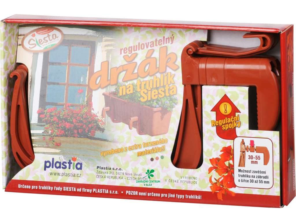 Regulovatelný držák truhlíku Siesta z extra tvrzeného plastu. Tento držák je určený k upevnění na zábradlí. V balení jsou 2 ks.