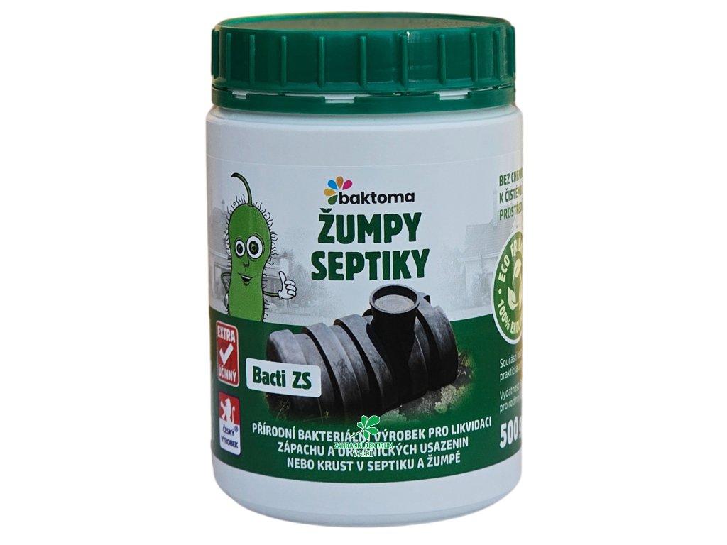 Bacti ZS je prostředek pro žumpy a septiky. Působením této směsi bakterií a enzymů dochází ke zkapalnění pevného organického odpadu, které se změní v nezapáchající kapalinu. Kapalinu lze pak odčerpat a použít pro zálivku trávy mimo záhony a dešťovou kanalizaci. Pokud má septik přepad, kapalina odteče.