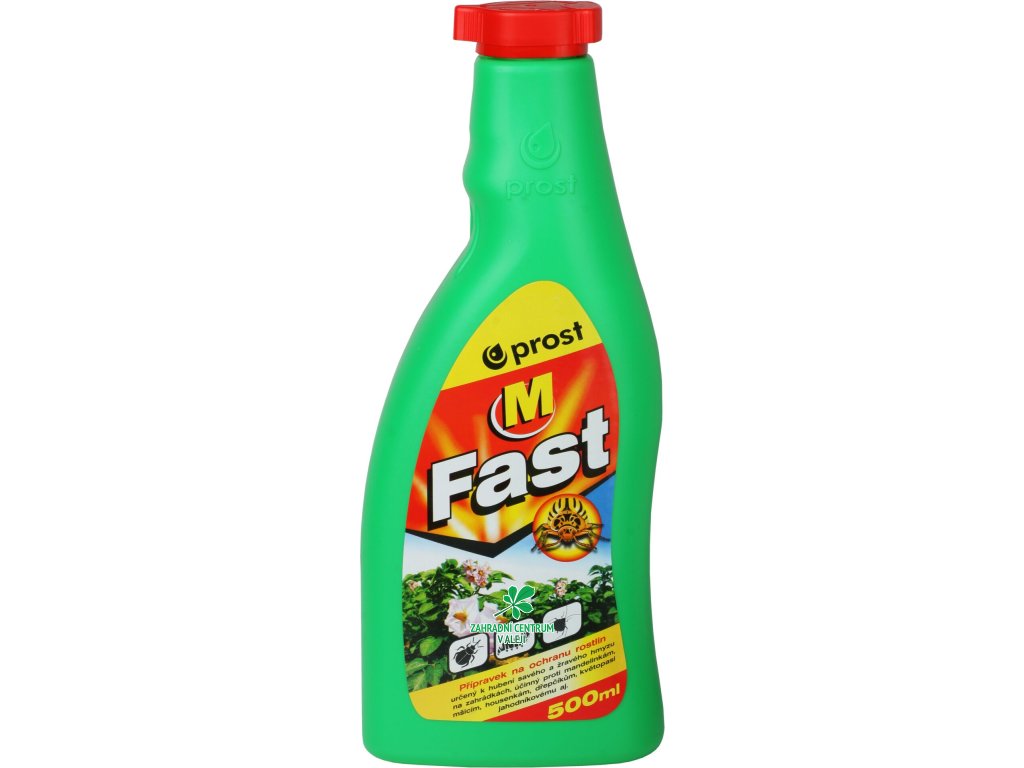 fast M je insekticidní přípravek určený k hubení škodlivého savého a žravého hmyzu (mandelinka, mšice, housenka, dřepčík, květopas jahodníkový a jiný savý a žravý hmyzu) v bytech a zahradách. Je dodáván jako vodní mechanický sprej (nebo náhradní náplň) pro přímé použití. Lokálně lze ošetřovat napadené rostliny bez nutnosti spotřebování celého obsahu náplně. Přípravek lze dlouhodobě skladovat a použít k akutnímu ošetření zeleniny, jahodníku, rajčat, brambor, okrasných rostlin apod. Použitá účinná látka ze skupiny syntetických pyrethroidů se poměrně snadno odbourává a proto jsou ochranné lhůty po ošetření krátké. Pro včely je přípravek relativně neškodný.