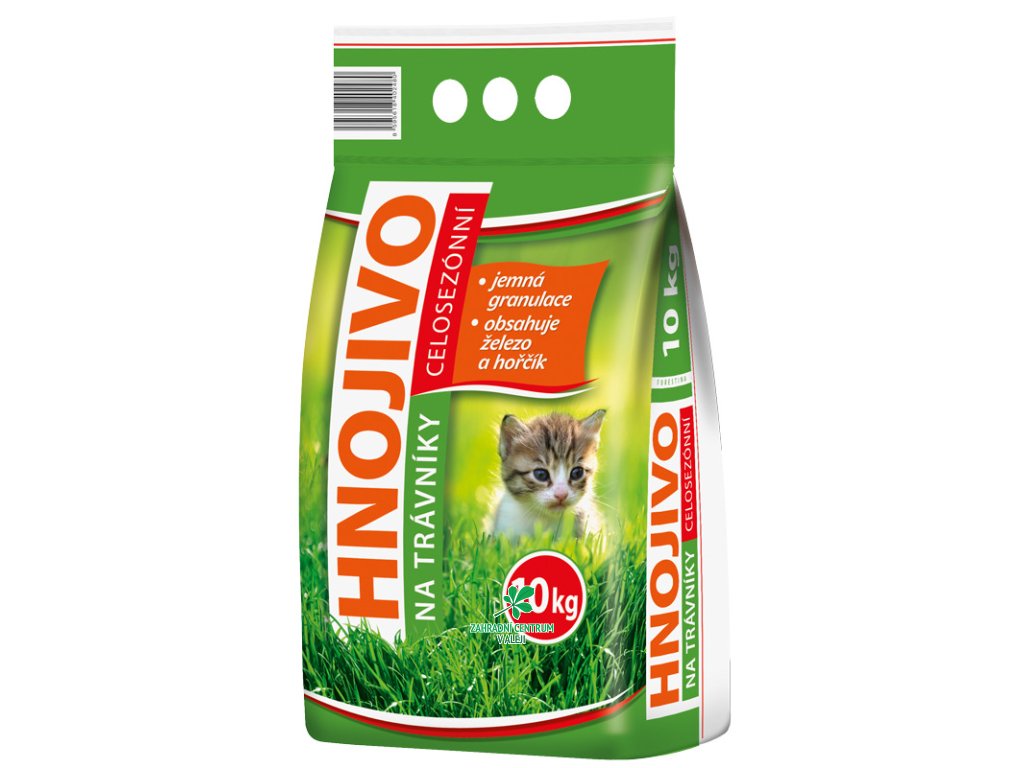Celosezónní hnojivo na trávník, obsahuje železo a hořčík.