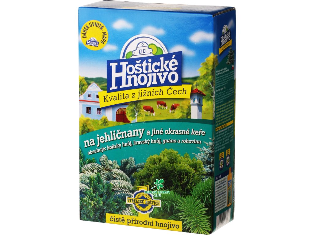 Hoštické organické hnojivo na jehličnany a jiné okrasné keře obsahuje fermentovaný kravský a koňský hnůj, drcenou a granulovanou rohovinu a přírodní guáno, pocházející z trusu mořských ptáků. Jedná se o čistě přírodní produkt, bez přídavku průmyslově vyráběných složek. Hnojivo dodává nejen potřebné živiny, ale výrazně aktivuje i půdní mikroflóru.