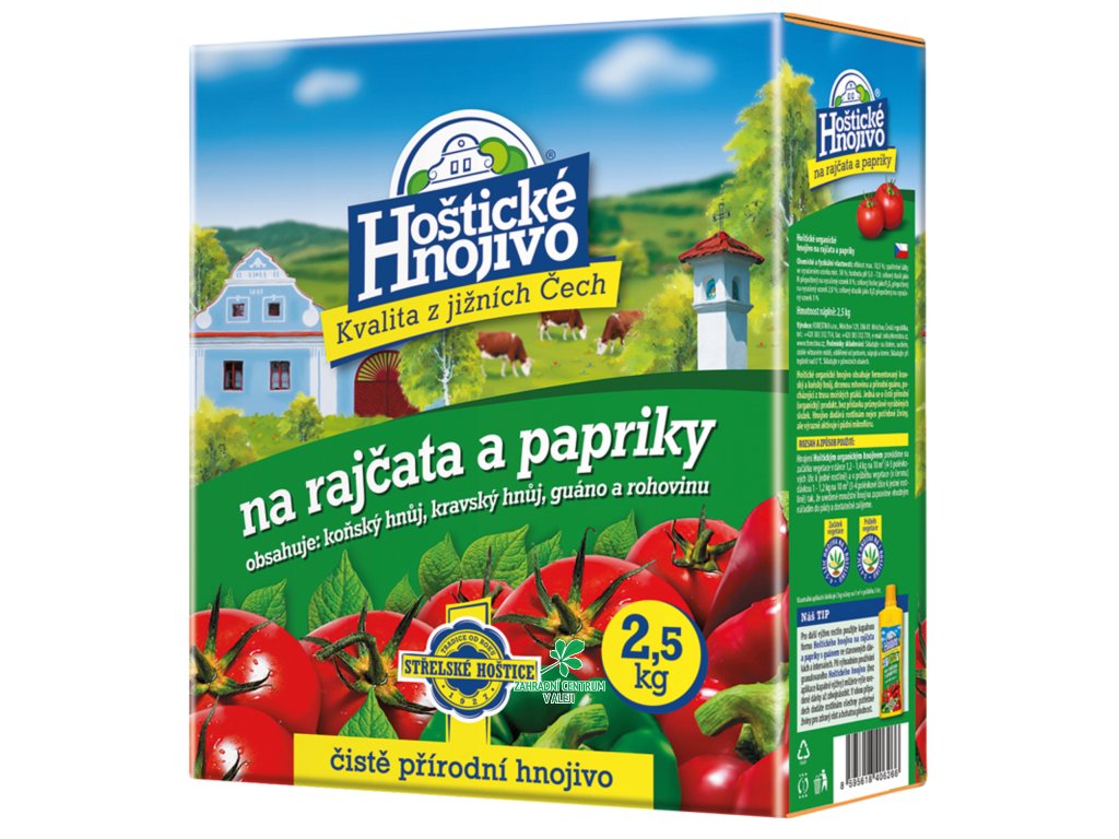 Hoštické organické hnojivo na rajčata a papriky obsahuje fermentovaný kravský a koňský hnůj, drcenou a granulovanou rohovinu a přírodní guáno, pocházející z trusu mořských ptáků. Jedná se o čistě přírodní produkt, bez přídavku průmyslově vyráběných složek. Hnojivo dodává nejen potřebné živiny, ale výrazně aktivuje i půdní mikroflóru.