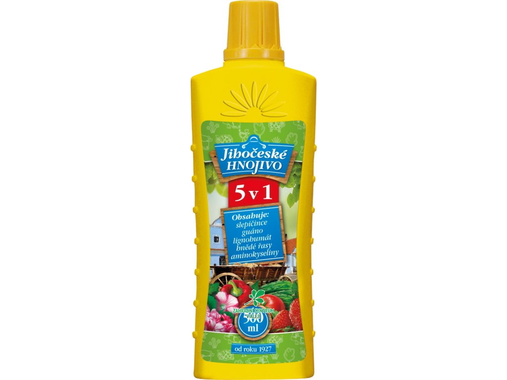 Jihočeské hnojivo 5 v 1 obsahuje: slepičince, guáno, lignohumát, hnědé řasy a aminokyseliny. Má široké použití při hnojení okrasných rostlin, ovoce, zeleniny, balkonových a pokojových rostlin. Hnojivo stimuluje růst, kvetení a výnosy. Je prevencí proti nežádoucím patogenům v půdním prostředí a potlačují rozvoj houbových chorob.