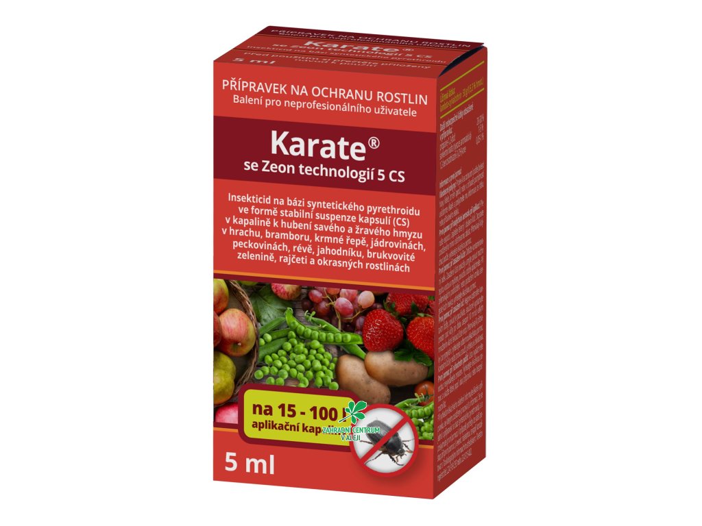 Karate je postřikový insekticidní přípravek ve formě syntetického pyrethroidu ve formě stabilní suspenze kapsulí v kapalině k hubení savého a žravého hmyzu v obilninách, hrachu, bobu, řepce olejce, hořčici bílé, bramboru, kukuřici na zrno, cukrovce, řepě krmné, vojtěšce, jeteli, jádrovinách, peckovinách, révě, lnu, jahodníku, čočce, brukvovité zelenině, rajčeti, okurce, paprice, česneku, mrkvi, petrželi, pastiňáku setém, fenyklu řapíkovém, kopru vonném, kmínu kořenném, okrasných rostlinách, lesních porostech a skladištních škůdců v prázdných skladech, silech a provozech.