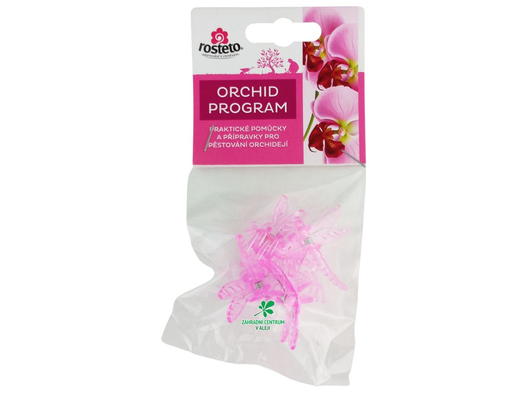 Dekorativní klipsy ve tvaru vážky slouží k uchycení květního stvolu orchidejí k opěrné tyčce. Jsou balené po 4 ks v igelitovém sáčku s EURO závěsem - pro možnost zavěšení na stojan.
