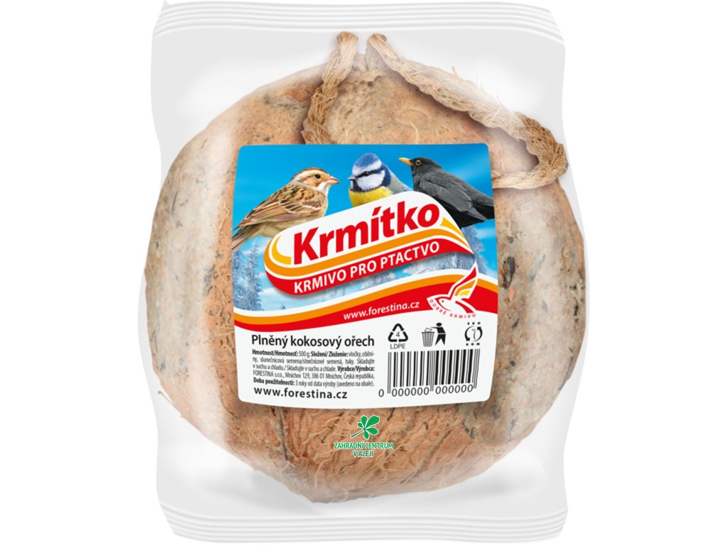Kokosový ořech se závěsem plněný lojo-semennou směsí.
