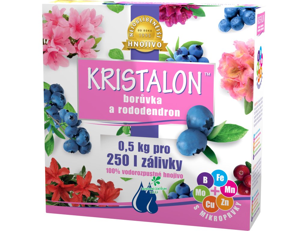 KRISTALON Borůvky a rododendron je krystalické hnojivo, vodorozpustné a určené pro rododendrony, azalky, borůvky a vřesy nebo vřesovce a jiné kyselomilné rostliny. Přispívá k lepšímu zakládání květů, které jsou pak viditelně bohaté a velké, a to díky přímé absorpci fosforu. Je to opravdový specialista pro kyselomilné rostliny.