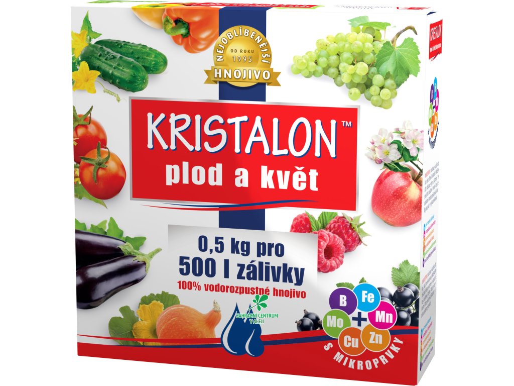 Kristalon Plod a květ je krystalické hnojivo, vodorozpustné a určené pro rychlejší start produkčního období rostlin. Podporuje vyšší násadu a vybarvení květů a plodů. Kristalon je univerzálně použitelný pro ovoce, zeleninu, okrasné rostliny včetně balkonových, ovocné stromy a keře, vinnou révu. Zamezuje žloutnutí listů. Aplikace zálivkou i postřikem na list cca 1x týdně Dávkování: 1 odměrka (10g) hnojiva se rozpustí v 10 l vody. Balení 0,5 kg vystačí na 500 l zálivky.