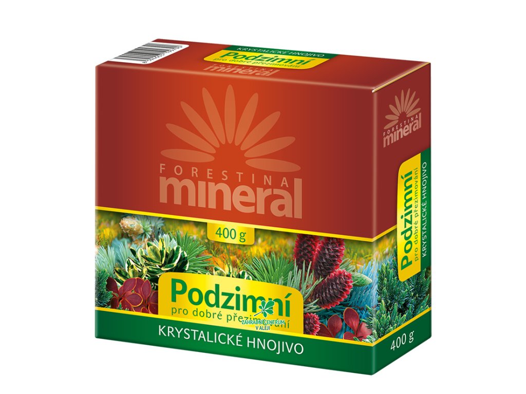 Krystalické hnojivo PODZIMNÍ je vodou rozpustné hnojivo určené k výživě všech druhů vytrvalých rostlin ( jehličnanů, ovocných i okrasných stromů, keřů a trvalek ) na podzim. Vyváženým složením hlavních živin a obsahem mikroprvků a zvýšeným obsahem draslíku poskytuje uvedeným rostlinám vše potřebné ke zdárnému přezimování.