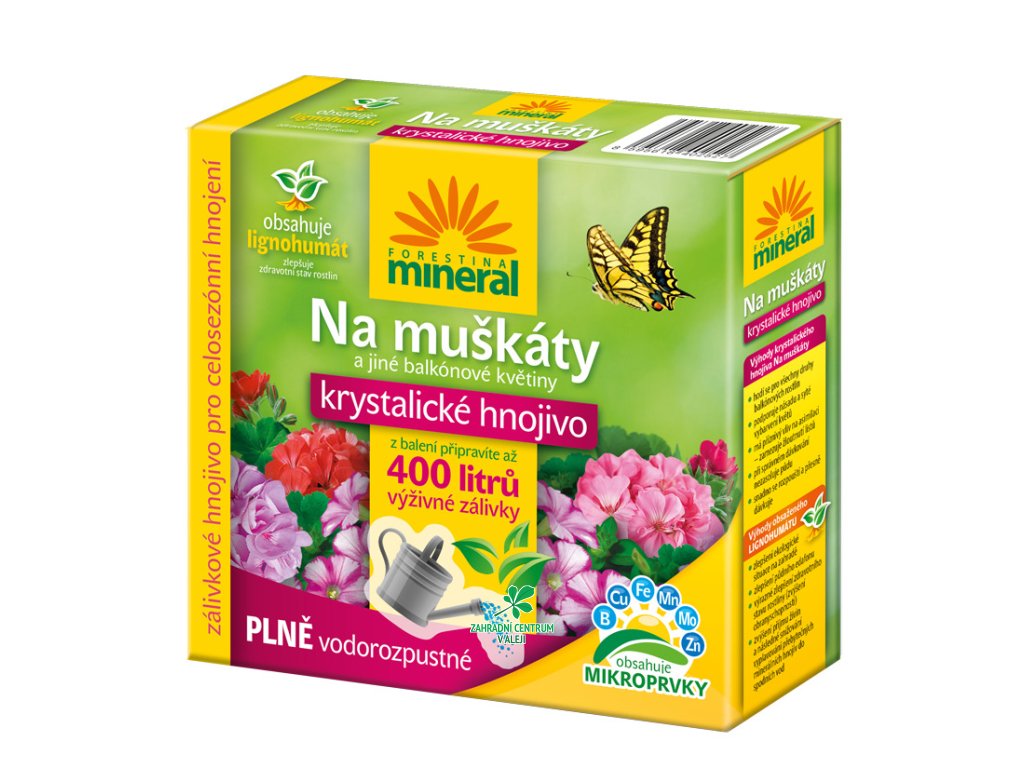 Krystalické hnojivo NA MUŠKÁTY a jiné balkónové květiny je vodou beze zbytku rozpustné hnojivo určené k výživě uvedených rostlin v průběhu jejich vegetačního cyklu. Vyváženým složením hlavních živin a obsahem mikroprvků poskytuje rostlinám vše potřebné ke zdravému vývoji. Vzhledem k vysokému obsahu fosforu výrazně ovlivňuje vysoké nasazení květů, ceněné zvláště u balkónových květin.