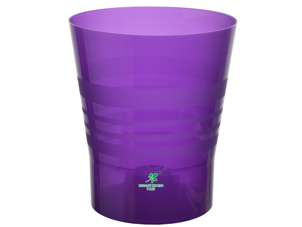 Průhledný plastový květináč pro orchideje v tmavě fialové barvě.
