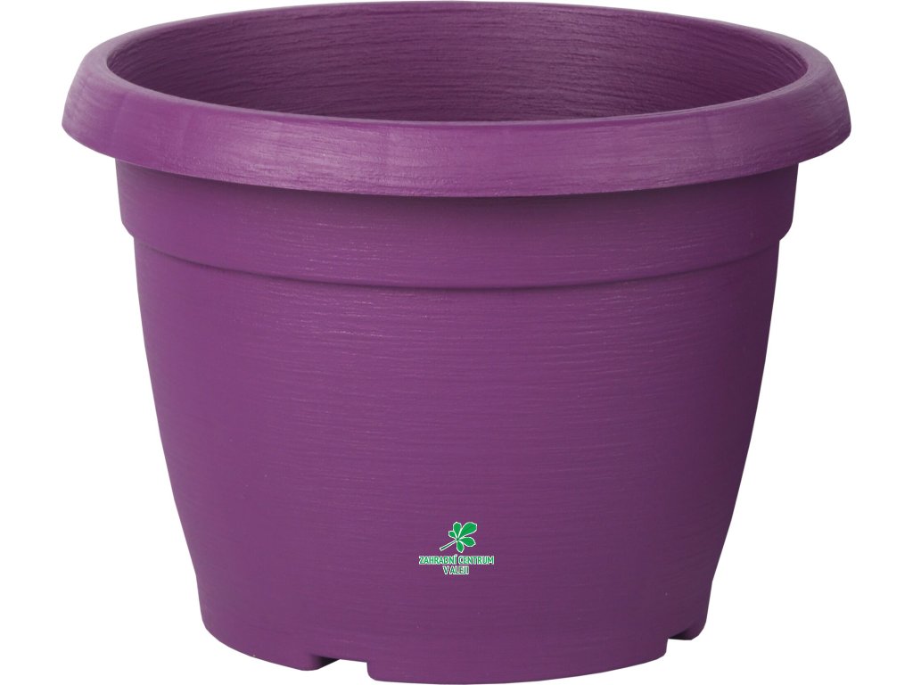 Květináč s dezénem a odtokovými otvory v barvě fialové.