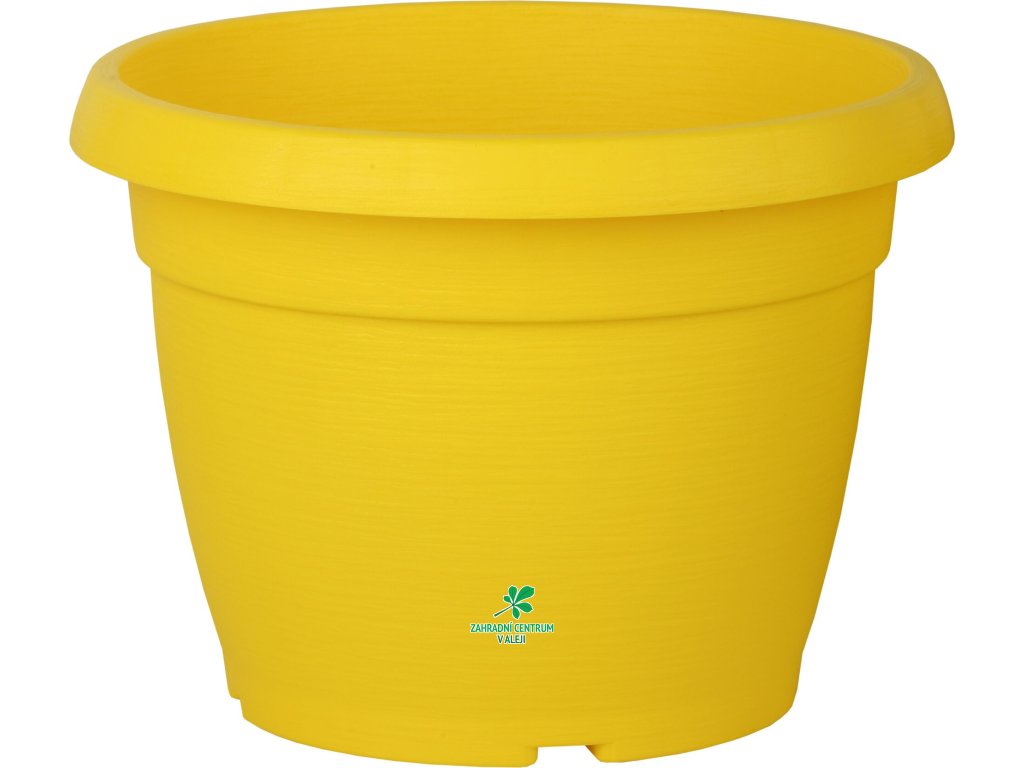 Květináč s dezénem a odtokovými otvory v barvě žluté.