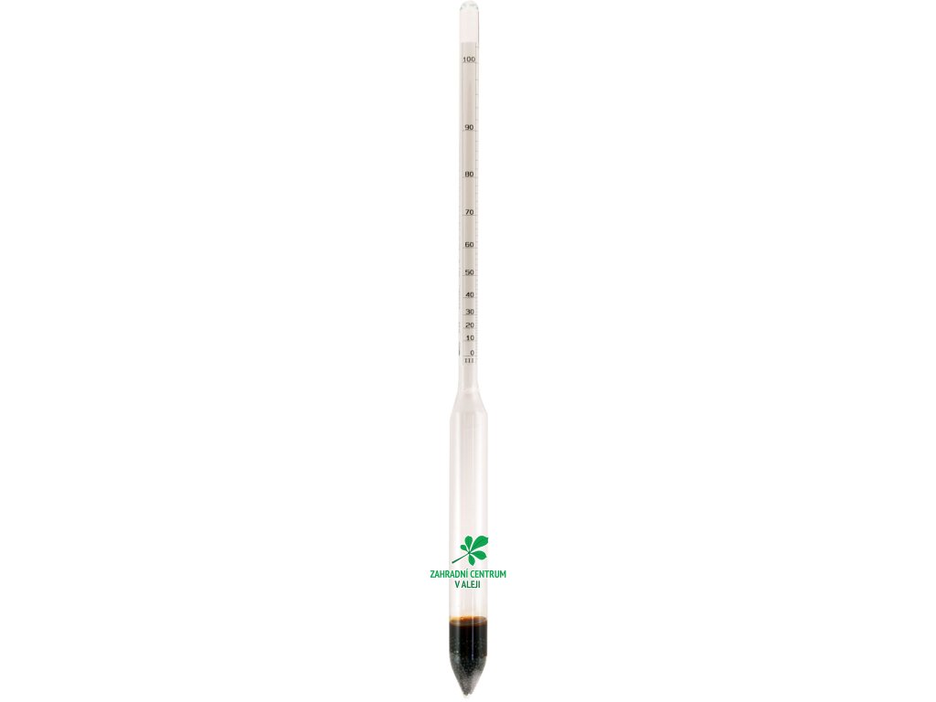 Lihoměr pro stanovení procent alkoholu v čistém destilátu, rozsah 0-100%.