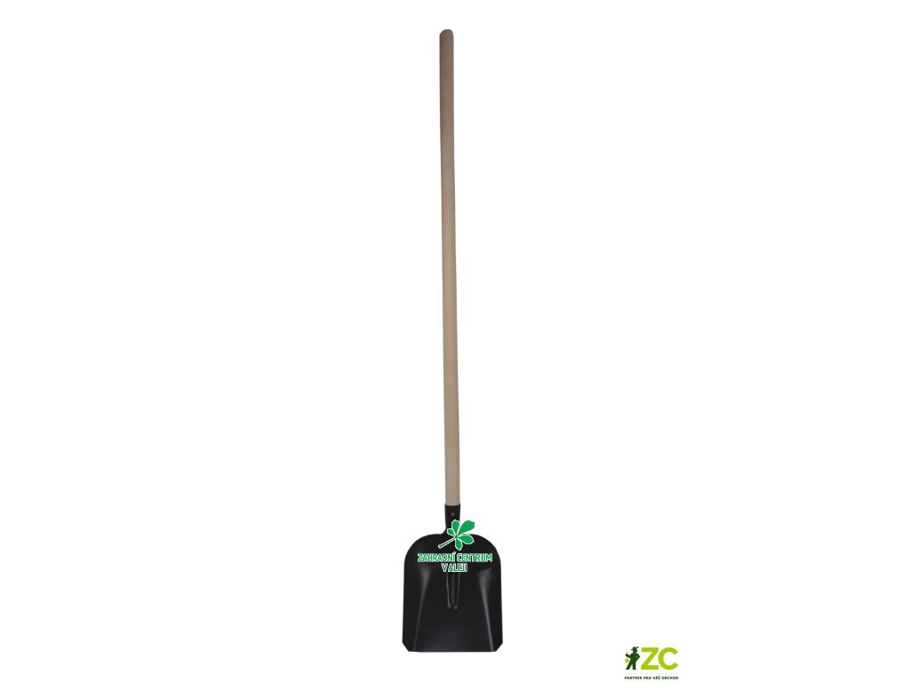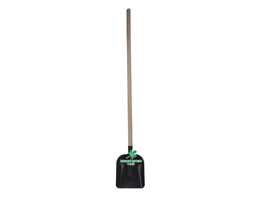 Černá hranatá lopata, vyrobená z oceli, s dřevěnou násadou.