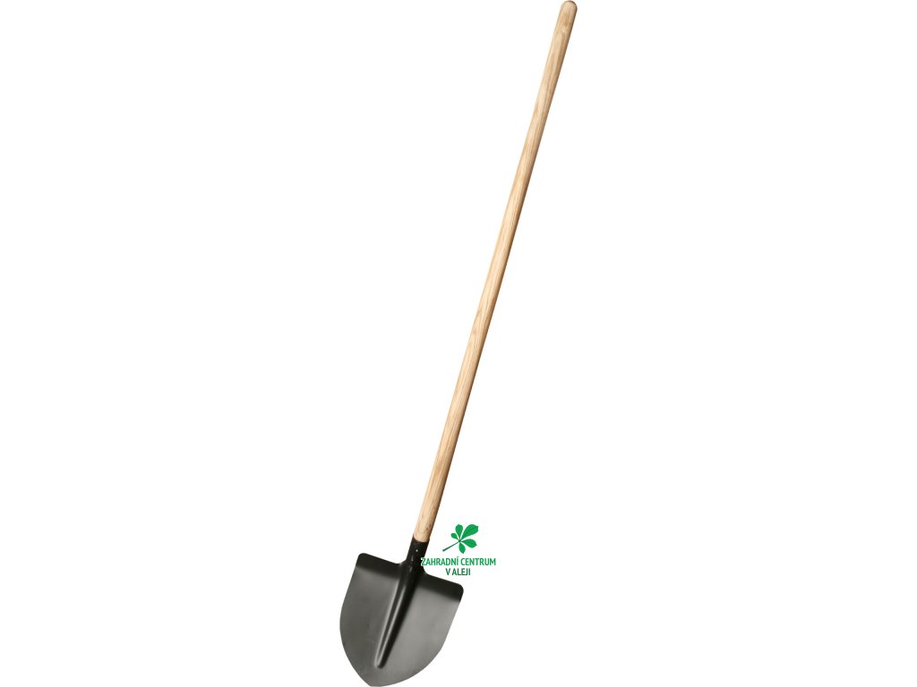 Černá špičatá lopata vyrobená z oceli, s dřevěnou násadou 130 cm.