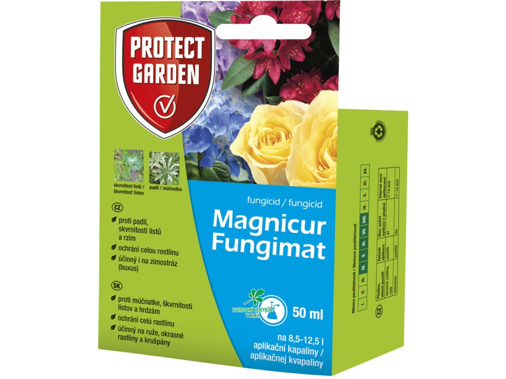 Postřikový fungicidní připravek určený k ochraně růží proti padlí, černé skvrnitosti a rzi, okrasných rostlin proti padlí a rzím a zimostrázu proti skvrnitosti listů a cylindrokladiové skvrnitosti listů.