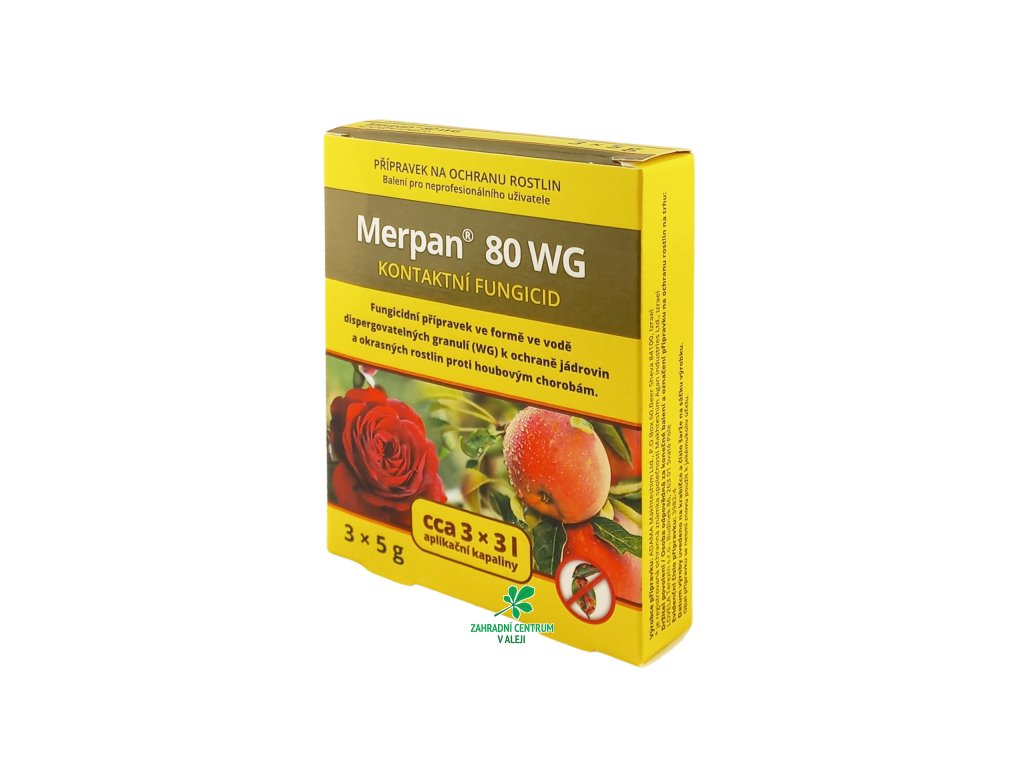 Merpan 80 WG je fungicidní přípravek ve vodě rozpustitelného mikrogranulátu. Merpan je ideální k ochraně ovocných dřevin, okrasných rostlin, zeleniny a révy proti houbovým chorobám. Fungicid je vhodný jako postřik proti plísním a dále také k moření hlíz a cibulí. Balení obsahuje 3 x 5g.