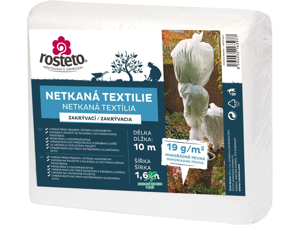 Bílá netkaná textilie je určena k ochraně rostlin před mrazem, krupobitím a živočišnými škůdci. Propouští světlo i vodu a její hmotnost 19g/m2 umožňuje zakrývání rostlin bez nutnosti budování konstrukce.