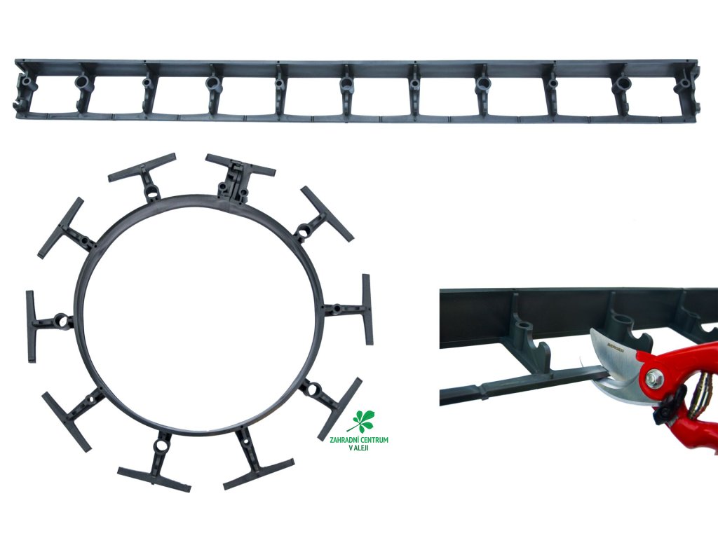 Obrubník je vyrobena z modifikovaného polypropylenu a je odolný proti povětrnostním vlivům. Jednoduchým nastřižením okraje ve ztenčené části lze obrubník snadno ohýbat do libovolného tvaru. Ideální na oddělení trávníku od květinových záhonů, dlažby, betonových ploch apod.