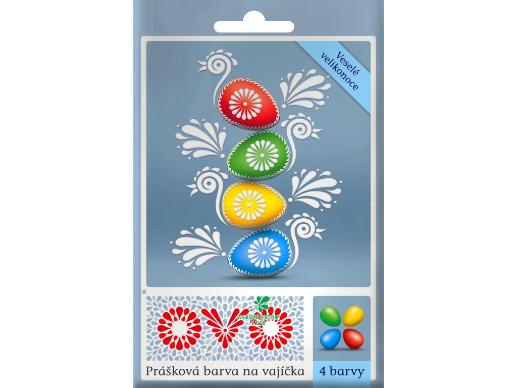 Čtyři práškové barvy ( žlutá, červená, modrá a zelená ) určené na barvení velikonočních vajec. Snadná a rychlá aplikace, výrazné barvy.