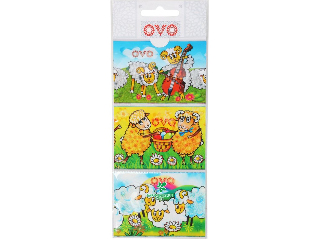 Smršťovací košilky s motivy beránků. Odstřihneme obrázek z pásu a navlékneme košilku na uvařené vajíčko, poté ponoříme na lžíci do horké vody na 3 sekundy.