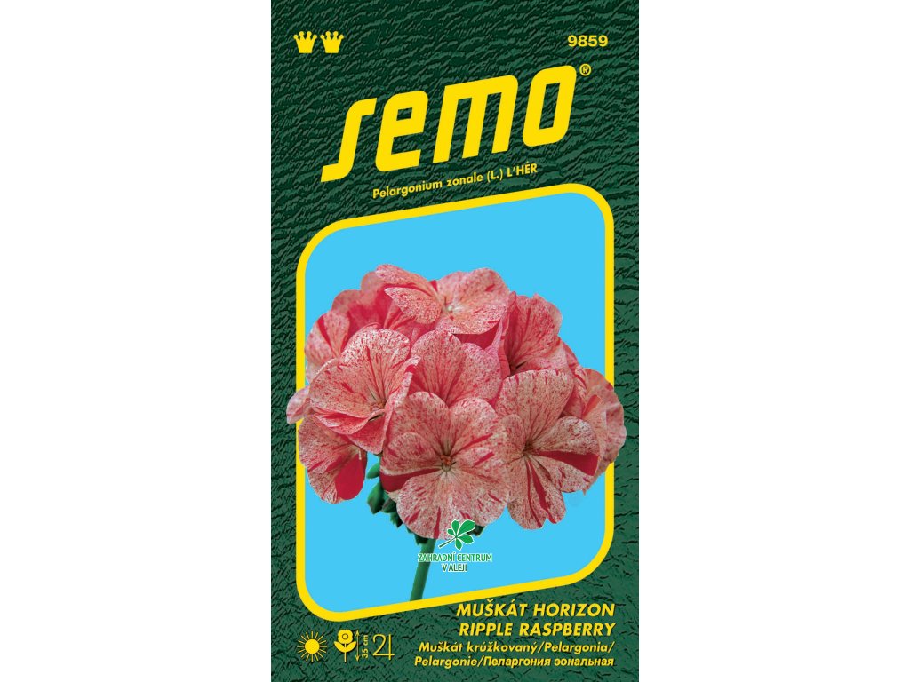 Odrůda s atraktivními soukvětími purpurově stříkaných květů na světlém podkladu. Listy jsou tmavě zelené jako u klasických červených odrůd, bez žíhání. Oblíbená trvalka pěstovaná jako letnička, výška 35cm. Rostliny s okrouhlým listem s charakteristickým proužkem. Uplatní se jako balkónová rostlina pro pěstování v nádobách, okenních truhlících i k výsadbě na záhony. Vyžaduje slunné stanoviště a provzdušněnou neutrální až zásaditou půdu. Předpěstování je časově náročné, trvá přibližně 4 měsíce. Vyséváme do propařené, strukturní zeminy a jemně zasypeme. Zajistíme doporučenou teplotu a po vyklíčení dostatek světla. Přepichujeme 3-4 týdny po výsevu. Následně rozsadíme jednotlivé rostliny do květináčů. V průběhu vegetace přihnojujeme a odstraňujeme uvadlé květy. K bohatému kvetení potřebují slunce a teplo. Přezimuje na světlém místě při teplotě min. 5-10°C
