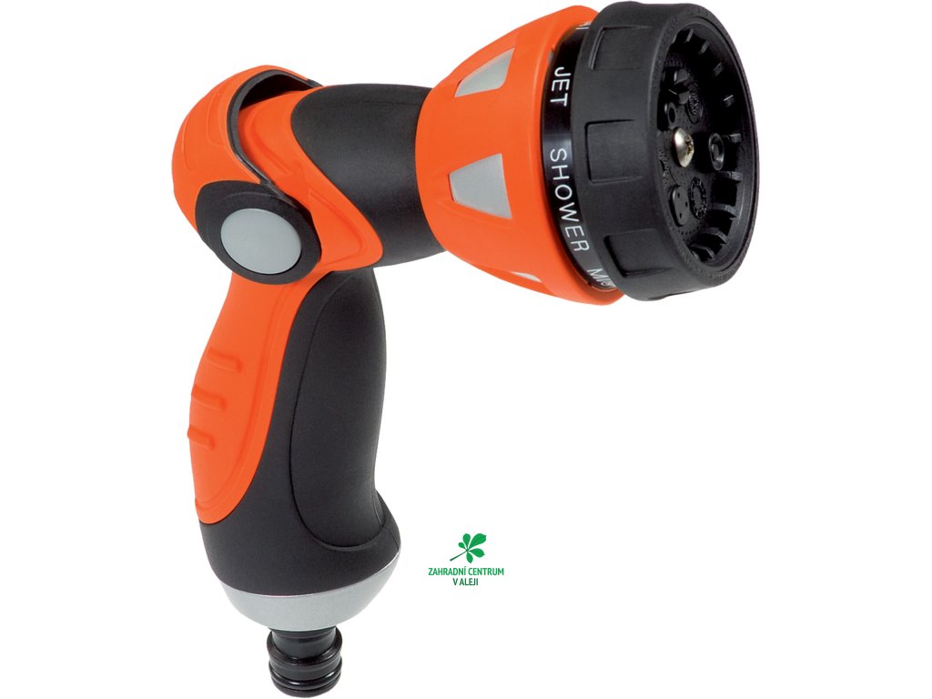 Víceúčelová postřikovací kovová pistole s ergonomickým držadlem, pryžovou hlavou, plynulou regulací rozstřiku, jednoduše ovladatelnou vpředu umístěnou aretací se sedmi druhy nastavení rozstřiku (sprcha, perlátor, mlžítko, proud atd.), se skvělým designem a funkční zdatností. Baleno v blistru.