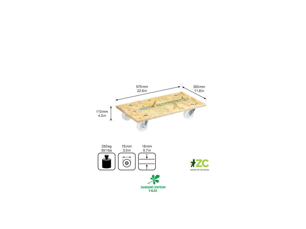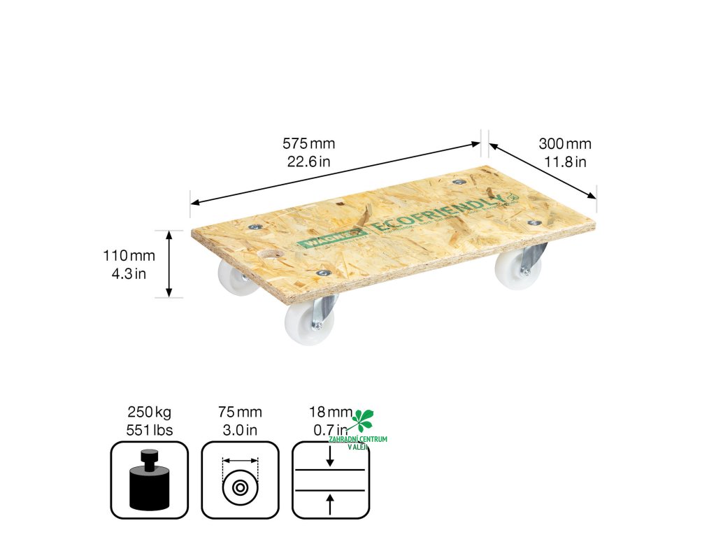 Přepravní plocha 575 x 300 mm, výška 110 mm, nosnost 250 kg.