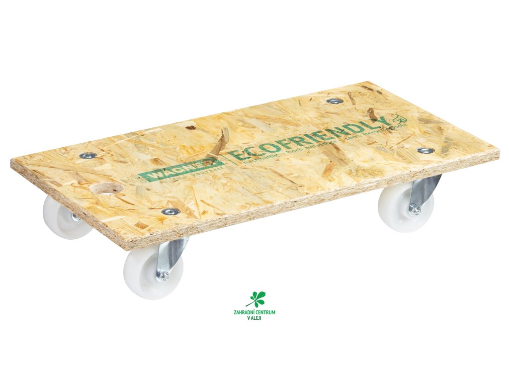 Transportní podložka OSB, otvor pro zavěšení, 4 otočná kolečka, nosnost 250 kg, přírodní 57,5 x 30 x 11 cm.