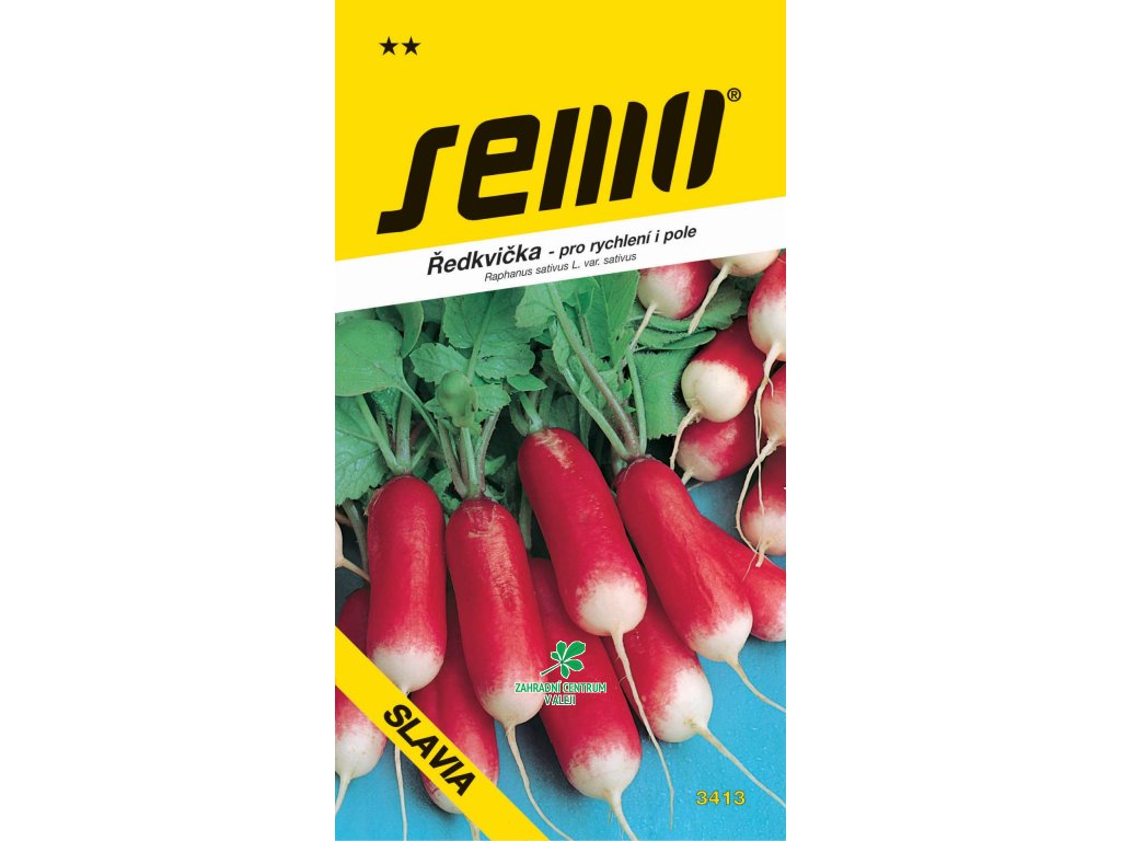 SLAVIA - červenobílá, podlouhlá bulvička do tří čtvrtin červená, spodní část je bílá typu Parisian Breakfast . Velmi raná odrůda vhodná k výsevu již od konce února k rychlení. Do volné půdy se vysévá v březnu a dubnu. Sklízí se od března do května. Je vhodná i pro pozdní pěstování. Vegetační doba od výsevu do sklizně je 32 – 35 dní, doporučený pěstební spon na rychlení je 15 x 3 cm.