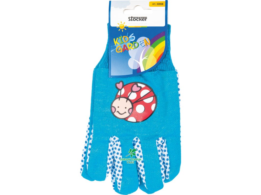 Dětské bavlněné pracovní rukavice, dlaňová strana a prsty s terčíky z PVC. Barva modrá s obrázkem.