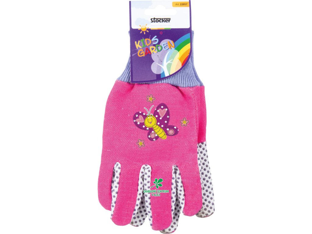 Dětské bavlněné pracovní rukavice, dlaňová strana a prsty s terčíky z PVC. Barva růžová s obrázkem.