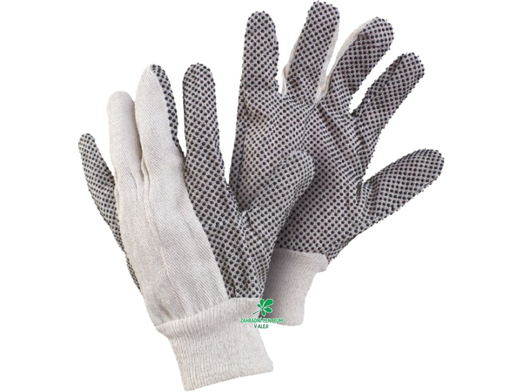 Pánské bavlněné pracovní rukavice kategorie CE 1 s pružným nápletem na zápěstí, dlaňová strana a prsty s terčíky z PVC.