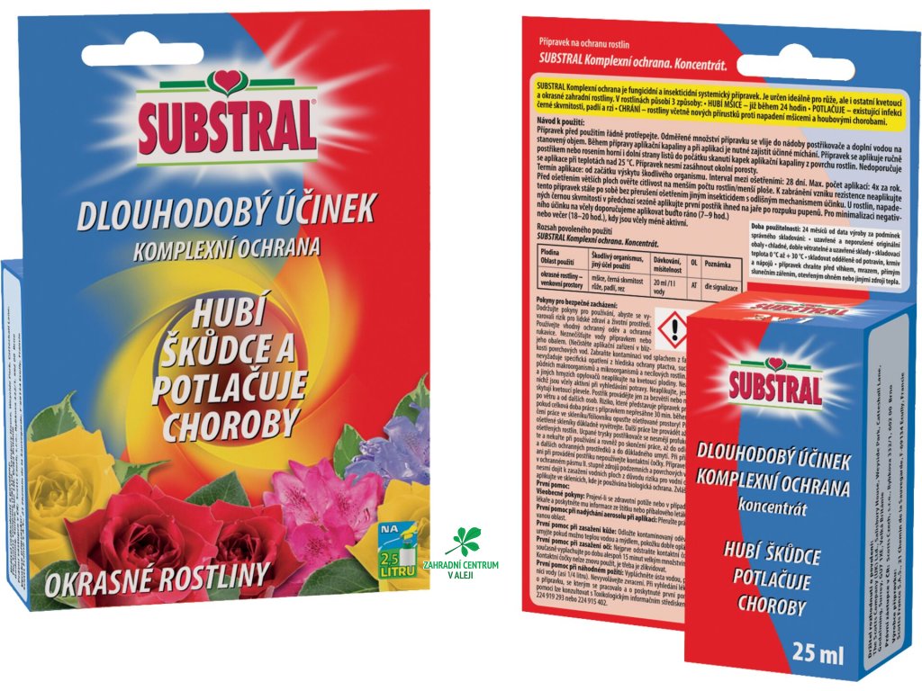 SUBSTRAL komplexní ochrana je fungicidní a insekticidní systemický přípravek. Je určen pro růže a jiné kvetoucí a okrasné zahradní rostliny. Hubí mšice, potlačuje infekci černé skvrnitosti, padlí a rzi a chrání rostliny.