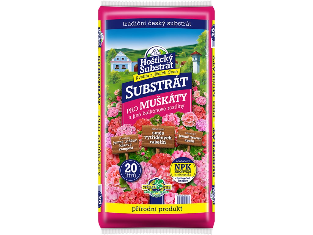 HOŠTICKÝ SUBSTRÁT PRO MUŠKÁTY A JINÉ BALKÓNOVÉ ROSTLINY je vyroben ze směsi vytříděné světlé a tmavé rašeliny, dobře vyzrálého jemně tříděného kůrového kompostu a jemně drceného zeolitu. K základnímu vyhnojení substrátu je použito minerální vícesložkového hnojiva s mikroprvky. Substrát je dále obohacen o fosforečné hnojivo. Půdní reakce je upravena jemně mletým dolomitickým vápencem.