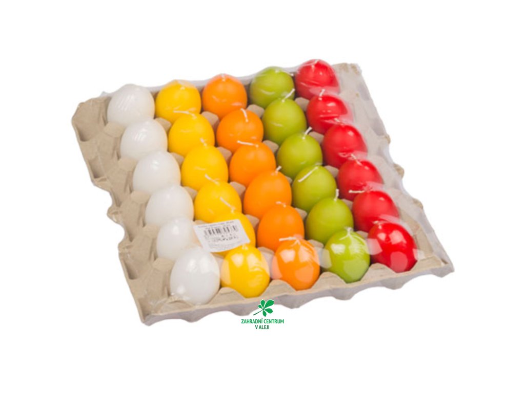 Velikonoční parafinová svíčka ve tvaru vejce. Prodejné jako celé plato - 30 ks.