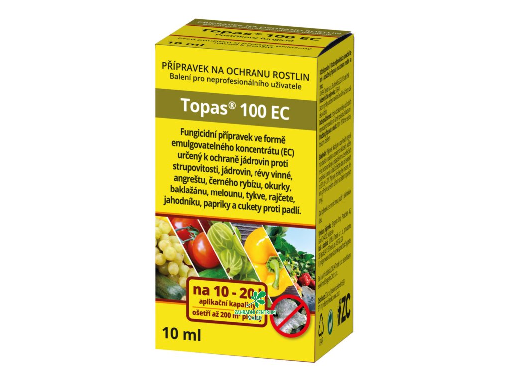 Topas 100 EC je systémově účinkující fungicid s výrazně vynikajícím účinkem proti pravému padlí v různých kulturách. Účinná látka proniká do rostliny prostřednictvím listů a stonků a nemůže dojít ke smytí deštěm. Topas 100 EC můžeme používat od začátku vegetace a dále pak v průběhu celé sezóny. Ošetřuje se preventivně ( padlí jabloňové a révové ).