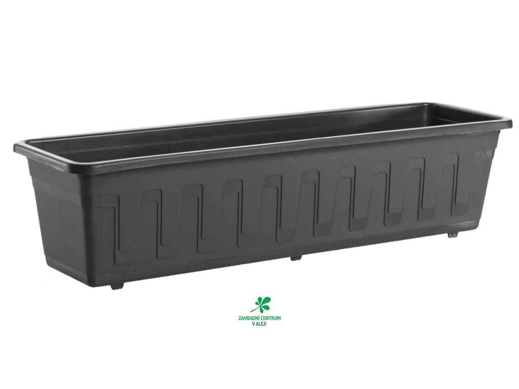 Plastový truhlík na květiny, pro lepší růst a snadnější zálivku se doporučuje provrtat dno pro odtok vody a kombinovat s miskou pod truhlík.