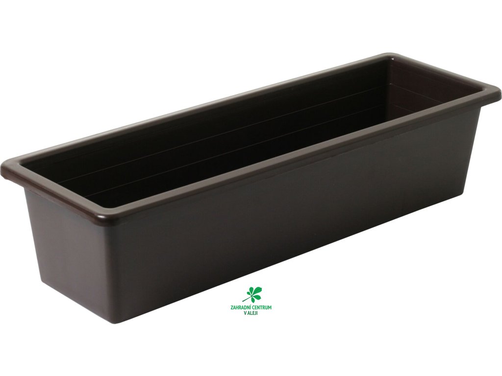 Plastový truhlík na květiny, pro lepší růst a snadnější zálivku se doporučuje provrtat dno pro odtok vody a kombinovat s miskou pod truhlík.